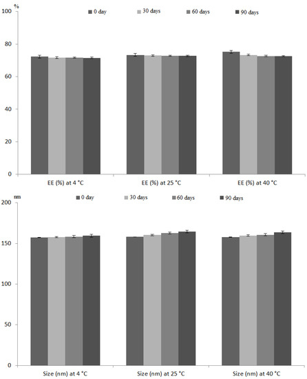 The effect of storage on the % EE and particle size of the optimum RLDL formulation at 4 °C, 25 °C and 40 °C. Each value was the mean ± standard deviation of measurements from three samples.
