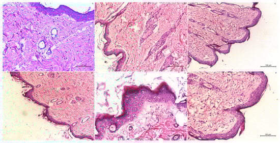 The antitumor activity was investigated by the quantification of the number and diameter of papilloma > 1 mm weekly. When compared to oral RXF suspension and RXF-loaded liposome gel containing 0% PG, the optimum RLDL formulation resulted in a significant (p < 0.05) decrease in the number and diameter of papilloma. The presence of malignant proliferative epithelial cells was discovered histopathologically in the +ve control group. This group had some vacuolated epithelial cells. Dermal granulation tissue appeared as a result of vascular proliferation. Additionally, hyperkeratosis, inflammatory cell infiltrations and signs of dermal toxicity appeared with oedema. The free RXF gel group showed no improvement in symptoms of skin toxicity in the dermis and epidermal layers (Figure 6C). Even following treatment with oral RXF, the size and number of papilloma increased but at a slower rate than the +ve control group (Figure 6D). In the dermal subcutaneous layer, the epidermis’ surface epithelium displayed hyperkeratosis and acanthosis, as well as a disseminated inflammatory reaction and edoema. The existence of a chronic proliferative reaction is indicated by hyalinosis of certain blood vessels (Angiopathic). RXF-loaded liposome gel with 0% PG gel group (Figure 6E) showed a moderate improvement in skin toxicity in terms of papilloma size and number. Despite the fact that the number and infiltration rates of inflammatory cells have improved in Figure 6E, hyperplasia in the skin persists. When compared to the RXF-loaded liposome gel containing 0% PG gel group, the optimum RLDL gel group Figure 6F exhibited a significant reduction in hyperplasia and hyperkeratosis. When compared to the –ve control group (mice received neither DMBA nor SNG, Figure 6A), the optimal RLDL gel group demonstrated an absence of inflammatory reactions inside the dermis, as well as a significant improvement in skin toxicity, with normal architecture, structure, and appearance in both the epidermal and dermal layers. Optimum RLDL gel showed improved anti-angiogenic and antitumor effectiveness when compared to oral RXF at the same dose. The papilloma were elucidated when RXF was introduced into deformable liposome gel carriers due to the targeting capabilities and sustained action of deformable liposome gel carriers.