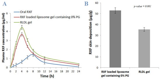 (A) Plasma RXF concentration (μg/mL) after oral and transdermal administration; (B) RXF concentration in the skin after application of RLDL gel and RXF-loaded liposome gel containing 0% PG.