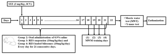 A schematic diagram for the experimental design showing Alzheimer’s disease induction by intra-cerebroventricular injection (ICV) of Streptozocin (STZ) (3 mg/kg) on the first day, followed by oral administration of 0.9% saline, Resveratrol (RES) suspension (10 mg/kg/day) and RES-loaded bilosomes (10 mg/kg/day) for Groups 2, 3 and 4 respectively for 21 days. Each group contained eight mice. All behavioral, biochemical, histological and immuno-histochemical assessments were conducted on day 21.