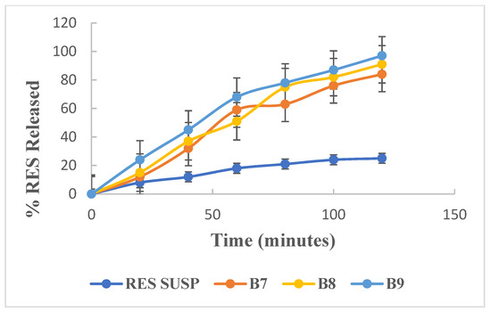 The effect of changing the pH of the medium and the addition of CH on the RES release rate from the prepared bilosomes was investigated. Figure 2 shows the results of the invitro release studies of the selected formulae (B7, B8 and B9) in comparison to RES suspension. RES release from suspension is characterized by a slow rate with only 18% and 25% released after 1 and 2 h, respectively, indicating incomplete drug release. In contrast, all RES-loaded bilosomes show gradual and almost complete release profiles with RES percent release ranging from 81% to 91% after 2 h, while RES-loaded bilosomes formula containing cholesterol shows a 97% RES release after 2 h, indicating the ability of the prepared vesicles to enhance RES release.