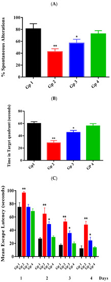 Figure 4A shows the % spontaneous alterations recorded for different groups after performing the Y-maze test. The % spontaneous alterations recorded for different groups show statistically significant (p < 0.05) differences between groups except for Gp 1 and Gp 4.