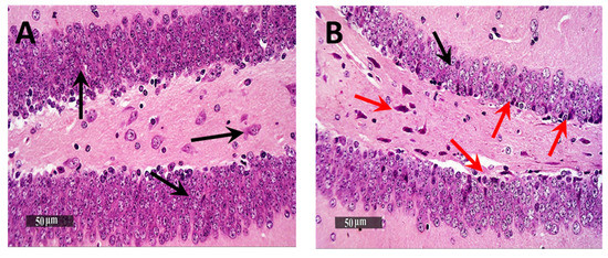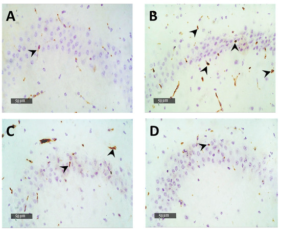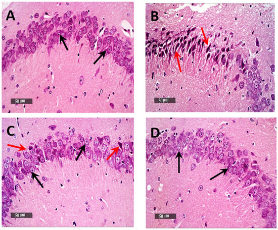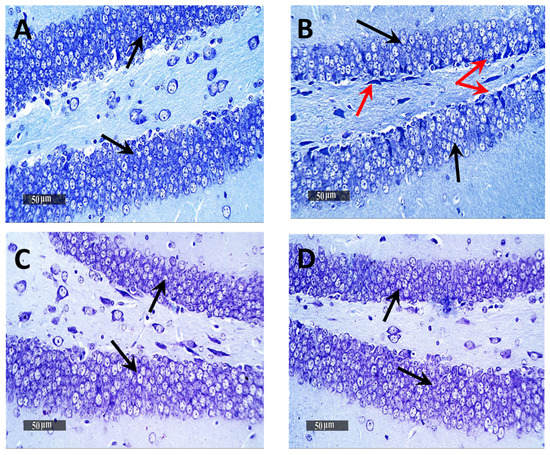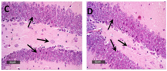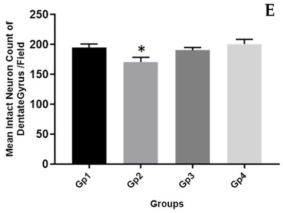 Microscopic examination of Dentate Gyrus sub-regions of normal control samples demonstrated many apparent intact well-organized granule cells neurons all over Dentate Gyrus blades (Figure 7A—black arrows) with mean intact granule cells count = 195 cells/field in Toluidine blue-stained tissue sections (Figure 8A). Moreover, almost intact hilar cells in the hilus region were observed. On the other hand, the Dentate Gyrus region of model samples showed moderate records of nuclear pyknosis and degenerative neuronal changes of inner small granule cells layer as well as hilar cells damage and loss (Figure 7B), with mean intact granule cells count = 170 cells/field (Figure 8B). Obvious neuroprotective efficacy was shown in Gps 3 and 4 subregions in different samples (Figure 7C,D, respectively), with almost the same records of mean intact granule cells counts observed resembling normal control samples, as well as almost intact hilar cells (Figure 8C,D). In addition, minimal sporadic records of degenerative changes in granule cells were observed.