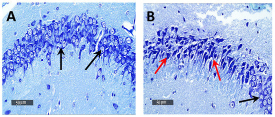 Mice brain tissue samples were dissected, flushed and fixed in 10% neutral buffered formalin for 72 h. Samples were processed in serial grades of ethanol, cleared in xylene, infiltrated and embedded into Paraplast plus tissue embedding media (Leica biosystems, Buffalo Grove, IL 60089 United States). Serial sagittal brain sections of 4 μm thick were cut by rotatory microtome to demonstrate the hippocampal regions in different samples and then mounted on glass slides. Tissue sections were stained by Hematoxylin and Eosin as a general staining method for microscopic examination and stained by Toluidine blue stain to demonstrate damaged and intact neurons, then examined by using a light microscope. All standard procedures and protocols for samples fixation and staining were performed according to Culling, 2013 [26].