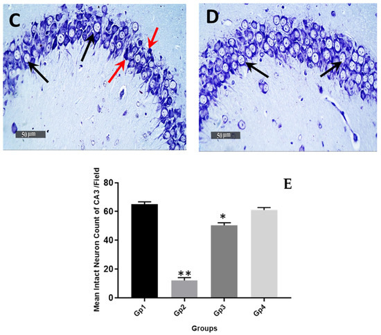 Light-microscopic examination of toluidine blue-stained pyramidal neurons in CA3/hippocampal sub-regions in different groups. (A) normal group, (B) negative control group (received 0.9% saline), (C) positive control group (received resveratrol suspension) and (D) test group (received resveratrol bilosomes). 400×. Black arrows = intact neurons, Red arrows = damaged neurons. The bar chart (E) shows the mean ± SD of the intact neuron count of CA3 in different groups where Gp 1 represents the normal group, Gp 2, Gp 3 and Gp 4 represent the negative control group (received 0.9% saline), positive control group (received resveratrol suspension) and test group (received resveratrol bilosomes), respectively, where (*) and (**) indicate statistically significantly different values from the control group at (p < 0.05 and p < 0.01), respectively.