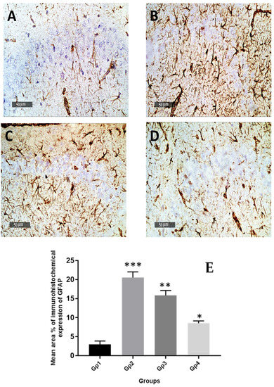 Effect of different treatments on hippocampal GFAP immuno-histochemical levels in reactive astrocytes expressed as the mean area percentage of expression. (A) Normal group, (B) Negative control group, (C) Positive control group and (D) Test group. 400×. The bar chart (E) shows the mean ± SD of the % area of immuno-histochemical levels expression of GFAP, where Gp 1 represents the normal group, Gp 2, Gp 3 and Gp 4 represent the negative control group (received 0.9% saline), positive control group (received resveratrol suspension) and test group (received resveratrol bilosomes), respectively, where (*), (**) and (***) indicate statistically significantly different values from the control group at (p < 0.05, p < 0.01 and p < 0.001), respectively.