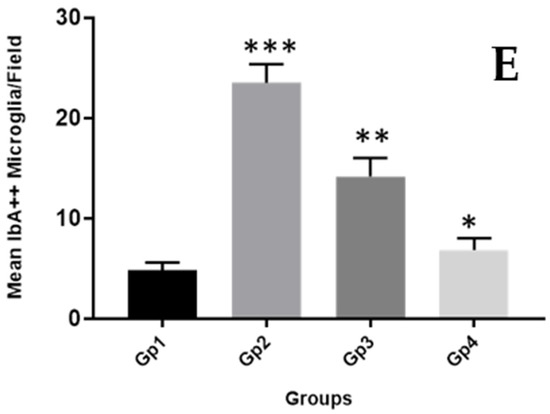 Effect of different treatments on hippocampal IbA/++ activated microglial cells count expressed as the mean number of IbA/++ cells per microscopic field. (A) Normal group, (B) Negative control group, (C) Positive control group and (D) Test group. 400×. The bar chart (E) shows the mean ± SD of the % area of immuno-histochemical levels expression of GFAP, where Gp 1 represents the normal group, Gp 2, Gp 3 and Gp 4 represent the negative control group (received 0.9% saline), positive control group (received resveratrol suspension) and test group (received resveratrol bilosomes), respectively, where (*), (**) and (***) indicate statistically significantly different values from the control group at (p < 0.05, p < 0.01 and p < 0.001), respectively.