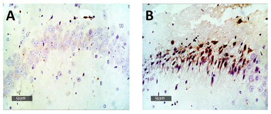 Immuno-histochemical staining for glial fibrillary acidic protein (GFAP) and IbA-1 and β-amyloid was conducted according to the manufacturer’s protocols and directions. Antigen Retrieved Brain tissue sections endogenous peroxidase was blocked by 3% hydrogen peroxide in methanol for 15 min followed by overnight incubation at 4 °C with the primary antibodies Anti-Glial Fibrillary Acidic Protein, by using a monoclonal antibody kit (Cat. No. 13-0300-Thermo-scientific Co. Waltham, MA, USA) 1:100), Anti-Iba1 antibody (ab108539-Abcam-1:100) and Anti-beta Amyloid antibody (ab201060-Abcam-1:500)was done, followed by washing with 3× PBS then incubation of the secondary antibody Horseradish Peroxidase (HRP) Envision kit (DAKO, Carpenteria, CA, USA) for 20 min, followed by 3× PBS washing and incubation with diaminobenzidine for 10 min. Then, counterstaining with Mayer’s hematoxylin was performed, followed by dehydration and clearing in xylene. Tissue sections were then covers-lipped for microscopic examination.