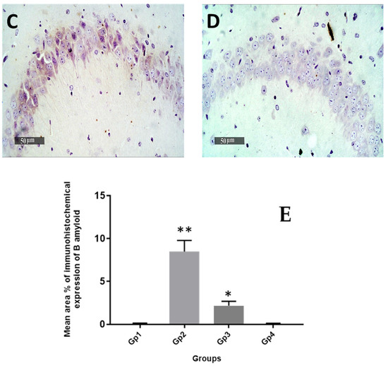 Table 2 shows that the normal level of Aβ and Tau proteins in normal mice (Gp 1) are significantly (p < 0.05) different from other groups, where Gp 2 showed the highest levels among all groups. Gps 3 and 4 show significantly (p < 0.05) lower levels than Gp 2. It has been reported that there is a mutual effect between Aβ1-42 and IL-6, where IL-6 stimulates the production of the β-amyloid precursor protein (APP), and contrarily, IL-6 is upregulated upon stimulation with the carboxy-terminal 105 amino acids of APP, enhancing the neuronal damage induced by Aβ1-42 [40].