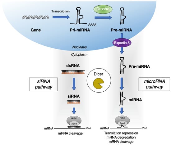 RNAi is a regulatory mechanism using small regulatory RNAs to prevent translation of mRNA and regulate protein expression levels. As an intrinsic mechanism for post-transcription editing, RNAi comprises two major different types of RNA molecules, siRNA, and miRNA, generated via similar mechanisms involving the dicer protein (Figure 1). Both siRNA and miRNA are short non-coding RNA strands that can silence the target mRNA in sequence-specific manner, therefore offering the advantage of greater selectivity and expanding the inhibitory action for undruggable targets. Despite numerous challenges involving delivery, safety, and potency, RNAi-based drugs have shown therapeutic potential in rare genetic diseases and complex diseases such as cancer [20,21,22,23,24].
