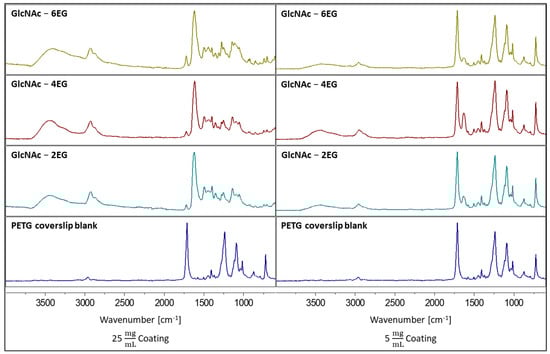 Coverslips were coated by carefully pipetting 10 µL of each polymer solution on a 13-mm PETG coverslip (Tissue Culture Coverslips 13 mm, Sarstedt, Nümbrecht, Germany) to obtain a fully coated surface. The coverslips were let dry in air for at least 4 h, followed by crosslinking with 3 J/cm2 at 254 nm. Washing 3× with ddH2O and 3× with ethanol, followed by drying in an N2 stream yielded the final coating, which was used directly for IR spectroscopy.