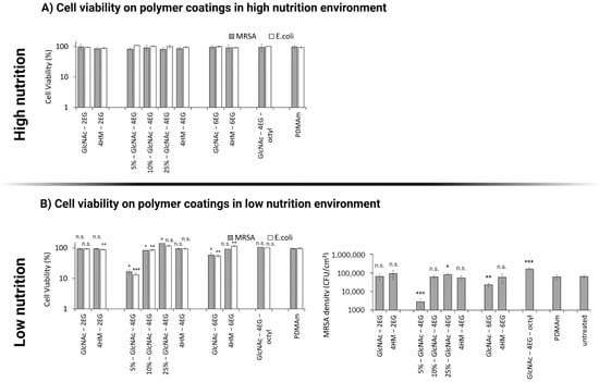 Polymers were diluted to a concentration of 25 or 5 mg/mL in a H2O/ethanol 5:1 mixture. The mixture was sterile filtered before use. From the mixture, 20 µL was pipetted into each well of a 48-well plate, 34.6 µL into each well of a 24-well plate, or 5.76 µL into each well of a 96-well plate. The plates were allowed to dry under sterile conditions for at least 4 h and crosslinked with 3 J/cm2 UV light at 254 nm, followed by 3× washings with 250 µL of phosphate-buffered saline (PBS).