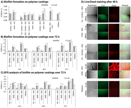 The following are available online at https://www.mdpi.com/article/10.3390/pharmaceutics13101647/s1. Figure S1: Brightfield images after crystal violet staining of biofilm formation on polymer coatings. Figure S2: Fluorescent images after Live/Dead staining of E. coli and MRSA in the high-nutrition environment after 24 h of cultivation. Figure S3: Fluorescent images after Live/Dead staining of E. coli and MRSA in the high-nutrition environment after 48 h of cultivation. Figure S4: Fluorescent images after Live/Dead staining of E. coli and MRSA in the high-nutrition environment after 72 h of cultivation.
