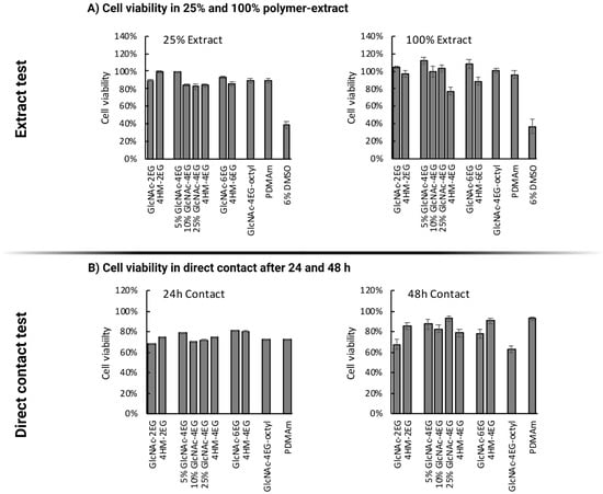 Polymer extracts were prepared according to USP standard []. Briefly, after coating a 24-well plate with polymers followed by washing steps, 317 µL of DMEM (20 mL for 120-cm2 coated surface) was added and the coating incubated for 24 h at 37 °C in a humidified 5% CO2 atmosphere. A cell suspension of L-929 in DMEM (100,000 cells/mL) was added to an uncoated 96-well plate (treated for cell culture, 100 µL/well) and grown to adherence overnight. Medium in each well was replaced by prepared extract medium (100 µL) or medium containing 6% Dimethyl sulfoxide (DMSO) for the cytotoxicity positive control and incubated for 72 h at 37 °C in a humidified 5% CO2 atmosphere. After 72 h, medium was replaced by 110 µL of DMEM containing 10% of a 10mM MTT solution in PBS. After incubating for 4 h in the incubator, 100 µL of 10% SDS in 0.01M HCl solution was added and incubated for 4 h. Absorbance was measured at 570 nm using a Tecan Infinite M2000 microplate reader. Cell viability was calculated as the percentage ratio of averaged absorbance of triplicate wells containing extract versus the averaged absorbance of untreated control wells.