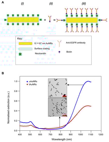 Similarly, the UV–vis absorbance values of targeted AuNRs were also determined after 2 µL of AuNRs was let to conjugate with 5.6 µL of biotinylated anti-EGFR (10 µg/mL) antibody in PBS by vortexing at 1000 RPM for 2 h at RT. This conjugation process of NeutrAvidin-coated AuNRs and biotinylated antibody resulted in the formation of a tAuNR conjugate (Figure 1A). NeutrAvidin-coated AuNRs were commercially sourced (Nanopartz) and their preparation chemistry (Au/polymer bridge/NeutrAvidin) remained proprietary; however, the binding of biotinylated anti-EGFR antibody to NeutrAvidin-coated AuNR was based on a strong biotin–NeutrAvidin binding affinity. The concentration of the AuNRs samples was calculated from the peak UV–vis–NIR absorbance values at 1064 nm after correcting for the dilution factor and subtracting the absorbance values of the blank sample [45]. Quantitation of targeted and untargeted AuNRs was repeated three times. All absorbance values at different wavelengths were divided by the maximum absorbance value at 400 nm wavelength in order to get extinction values [46], and the UV–vis analysis graph was plotted using normalised extinction (arbitrary units) and wavelength (nm). Compared with the uAuNRs, the absorbance values of tAuNRs UV–vis were significantly lower and this could be due to the antibody–AuNRs conjugation process involving 3 consecutive washes in PBS. Overall, a loss of 64.1%, 45.7% and 23.2% was calculated during 3 different time periods and an average total loss of 44.3% AuNRs was calculated following antibody conjugation process, and this loss was added as a compensation to all targeted groups. Figure 1B shows the normalised extinction values of both uAuNR and tAuNR at different wavelengths following three repeat measurements using UV–vis and their respective transmission electron microscopy (TEM) images (inset).