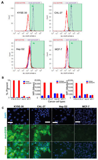 CAL-27 and KYSE-30 cancer cells express high level of EGFR. (A) Flow cytometry (red, isotype and blue, anti-EGFR staining); EGFR-positive cancer cell lines KYSE-30 and CAL-27 had an 8.7 and 7-fold increase in fluorescence in the presence of anti-EGFR antibody, respectively, while EGFR-negative cancer cell lines Hep G2 and MCF-7 showed no such increase. The y-axis represents the number of events (counts) and the x-axis represents the fluorescence signal intensity from the EGFR-bound antibody. (B) Quantification of flow cytometry results as a percentage of total cells (% parent), mean and median fluorescence intensity of both isotype and anti-EGFR antibodies in 4 different cancer cell types. (C) Immunofluorescence staining of these four cancer cell lines using anti-EGFR and isotype antibodies showed a high expression of EGFR in KYSE-30 and CAL-27 compared with Hep G2 and MCF-7 cancer cell lines. Scale bars, 50 µm.