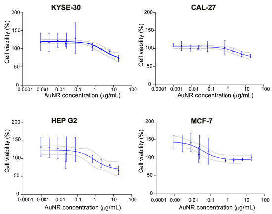 AuNRs had no cytotoxic effect on either EGFR-positive or EGFR-negative cancer cells. Dose-response curves for different cancer cell lines, n = 3, the dotted lines represent 95% CI.