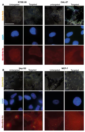 Images showing different intensities of AuNRs signals in EGFR-positive and negative cancer cell lines. Dark-field, DAPI and Texas Red images of (A) EGFR-positive cancer cell line KYSE-30 and CAL-27 and (B) EGFR-negative cancer cell lines Hep G2 and MCF-7 were taken for both tAuNRs and uAuNRs groups. All dark-field (where bright yellow-to-orange colour aggregates represent AuNRs), DAPI and Texas Red (MemBrite fix) images were captured using an inverted Nikon microscope with a uniform setting throughout. Scale bar, 200 µm.