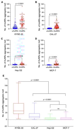 There was a significantly higher (p < 0.0001) number of tAuNRs aggregates in KYSE-30 compared with CAL-27, Hep G2 and MCF-7, suggesting that tAuNRs targeted KYSE-30 at an increasingly higher rate than they did the remaining three cancer cell lines (Figure 5E). Likewise, there was a significantly higher (p < 0.0001) number of tAuNRs aggregates per cell in CAL-27 than in both Hep G2 and MCF-7 cancer cells. When the ratios of the median numbers of AuNRs aggregates in tAuNRs and uAuNRs were compared for each cell line, they were found to be 6.4, 9, 4 and 2 for KYSE-30, CAL-27, Hep G2 and MCF-7 cells, respectively.