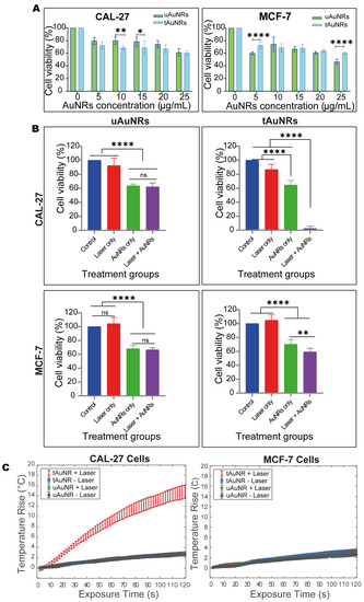 Photothermal therapy increases cancer cell death using EGFR-targeted AuNRs. (A) Analysis by ordinary two-way ANOVA showed reduced cell viability in both CAL-27 and MCF-7 cancer cells incubated with increasing concentrations of uAuNRs and tAuNRs. (B) Ordinary one-way ANOVA test demonstrated that there was no significant reduction in cell viability from the combination of uAuNRs with laser in both CAL-27 and MCF-7 cells other than the toxicity caused by the AuNRs themselves. On the other hand, tAuNRs and laser combination caused a significant reduction in cell viability in CAL-27 cancer cells and a relatively less significant reduction in cell viability in MCF-7 cells. (C) Well-averaged temperature rise from the different exposure conditions in CAL-27 and MCF-7 cancer cell lines. For all conditions, data are shown as mean ± SD and n = 7 or 8. Asterisks indicate a significant difference: * p < 0.5, ** p < 0.01, **** p < 0.0001 and ns, not significant.