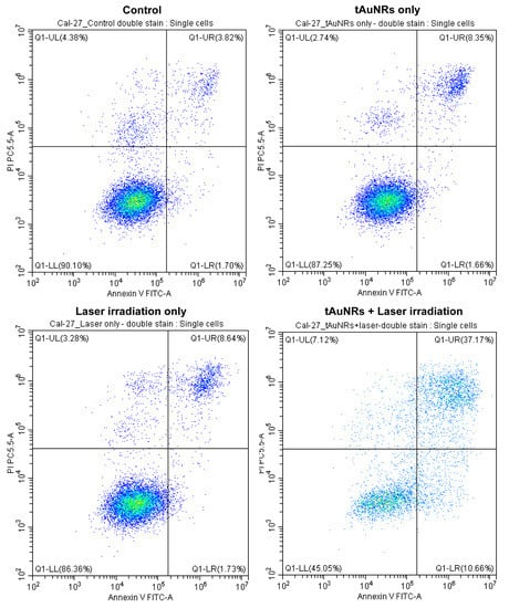 Apoptotic cell death in CAL-27 cells following tAuNR and laser treatment. Cells were incubated with tAuNRs alone, with laser irradiation alone or with their combination (tAuNRs + laser irradiation). Flow cytometry analysis of these cells stained with annexin V FITC and PI alongside untreated (control) cells is shown. Gating was determined based on the control cells and used for the treatment groups to determine the percentage of healthy cells (Q1-LL), cells in early apoptosis (annexin-V-positive, PI-negative, Q1-LR), cells in late apoptosis (annexin-V-positive, PI-positive, Q1-UR) and the percentage of cells undergoing necrosis (PI-positive, annexin-V-negative, Q1-UL). Total number of single cell events: control, 10,728; tAuNRs, 10,890; laser only, 10,988 and tAuNRs + laser, 4899.