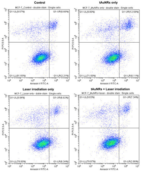 Apoptotic cell death in MCF-7 cells following tAuNR and laser treatment. Cells were incubated with tAuNRs alone, with laser irradiation alone or with their combination (tAuNRs + laser irradiation). Flow cytometry analysis of these cells stained with annexin V FITC and PI alongside untreated (control) cells is shown. Gating was determined based on the control cells and used for the treatment groups to determine the percentage of healthy cells (Q1-LL), cells in early apoptosis (annexin-V-positive, PI-negative, Q1-LR), cells in late apoptosis (annexin-V-positive, PI-positive, Q1-UR) and the percentage of cells undergoing necrosis (PI-positive, annexin-V-negative, Q1-UL). Total number of single cell events: control, 11,920; tAuNRs, 12,495; laser only, 11,775 and tAuNRs + laser, 12,079.