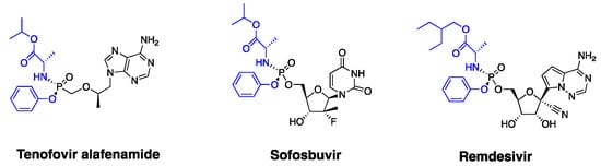 Nucleoside/nucleotide analogs remain an important class of antivirals in clinics. These therapeutics commonly exert their antiviral effects intracellularly through the formed active metabolites, triple phosphate nucleoside (TP-Nuc), which inhibit the viral polymerase or/and terminate the elongation of the viral nucleic acid chain [1]. However, nucleotide/nucleoside analogs have limitations, such as limited cell permeability associated with the polar molecular structure and inefficient intracellular activation. To improve cell permeability and pharmacokinetic performance, nucleoside/nucleotide analogs are often structurally modified to be ester prodrugs [2]. The ProTide technology has been a powerful tool to improve the cell permeability and the intracellular activation of nucleoside/nucleotide antivirals and anticancer drugs [3,4]. The most recent ProTide technology is to structurally modify nucleoside/nucleotide analogs to aryloxy phosphoramidite prodrugs by masking two of the oxygens of the monophosphate and monophosphonate groups with an aryloxy group and an amino acid ester group. The ProTide prodrugs have two advantages over parent nucleoside/nucleotide forms: (1) great cell permeability due to low polarity; (2) rapid intracellular activation by avoiding the rate-limiting monophosphorylating process [3,5,6,7]. There are at least three FDA-approved ProTide prodrugs, including tenofovir alafenamide (TAF), sofosbuvir (SBV), and remdesivir (RDV) (Figure 1). Among these, TAF has been commonly used against hepatitis B virus (HBV) and human immunodeficiency virus (HIV), while SBV is mainly used for treating hepatitis C virus (HCV) infection. RDV was recently approved for the treatment of coronavirus disease 2019 (COVID-19) due to its promising antiviral effects against severe acute respiratory syndrome coronavirus-2 (SARS-CoV-2). TAF and SBV have also been proposed to be alternatives for COVID-19 treatment based on their anti-SARS-CoV-2 effects observed in vitro [8,9].