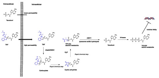 - Birkus, G.; Bam, R.A.; Willkom, M.; Frey, C.R.; Tsai, L.; Stray, K.M.; Yant, S.R.; Cihlar, T. Intracellular activation of tenofovir alafenamide and the effect of viral and host protease inhibitors. Antimicrob. Agents Chemother. 2016, 60, 316–322. [Google Scholar] [CrossRef] [PubMed] [Green Version]