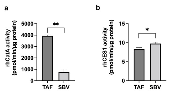 Activity of rhCatA (a) and rhCES1 (b) for TAF and SBV hydrolysis. 0.5 ng/µL rhCatA and 40 ng/µL rhCES1 were incubated with 20 µM TAF or SBV at 37 °C for 5 and 20 min, respectively. The enzyme activity was calculated by dividing the disappearance amount of the prodrug by the enzyme concentration and incubation time. Bars show mean values (±S.D.) of three independent experiments (n = 3). * p < 0.05 and ** p < 0.01 indicate statistically significant difference between TAF and SBV groups by Student’s t-test.