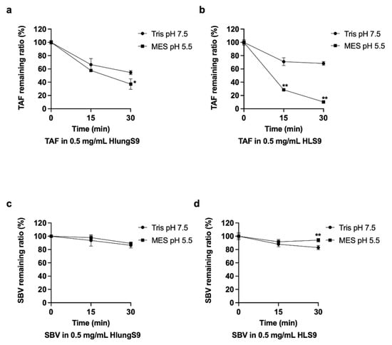 TAF and SBV hydrolysis in HlungS9 and HLS9: 20 µM TAF were incubated with 0.5 mg/mL HlungS9 (a) and HLS9 (b) at 37 °C for 15 and 30 min in MES assay buffer (pH 5.5) and Tris buffer (pH 7.5); 20 µM SBV were incubated with 0.5 mg/mL HlungS9 (c) and HLS9 (d) at 37 °C for 15 and 30 min in MES assay buffer (pH 5.5) and Tris buffer (pH 7.5). Data are shown as the remaining TAF or SBV (%) after incubations (mean ± S.D., n = 3, except for SBV with 0.5 mg/mL HlungS9 in MES pH 5.5, where n = 2). * p < 0.05 and ** p < 0.01 vs. the Tris pH 7.5 condition (Student’s t-test).