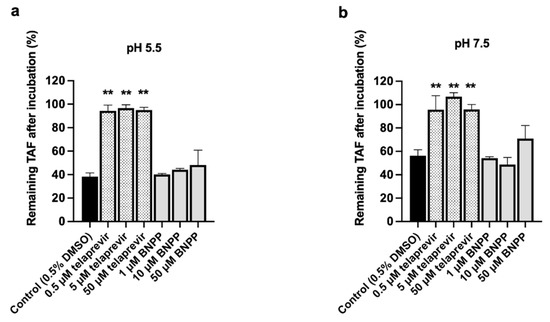 To further confirm the role of CatA and CES1 in HlungS9 for TAF hydrolysis, we evaluated the effects of CatA inhibitor (telaprevir) and CES1 inhibitor (BNPP) on TAF hydrolysis in HlungS9. The inhibitory effects are displayed in Figure 6. In both the pH 5.5 and pH 7.5 conditions, telaprevir at 0.5~50 µM could nearly abolish TAF hydrolysis in HlungS9 (p < 0.01, compared with the control group). BNPP appeared to have a slight inhibitory effect on TAF hydrolysis in HlungS9 only at 50 µM without reaching a statistically significant difference (p = 0.15 and 0.09 compared with the control group at pH 5.5 and pH 7.5, respectively).