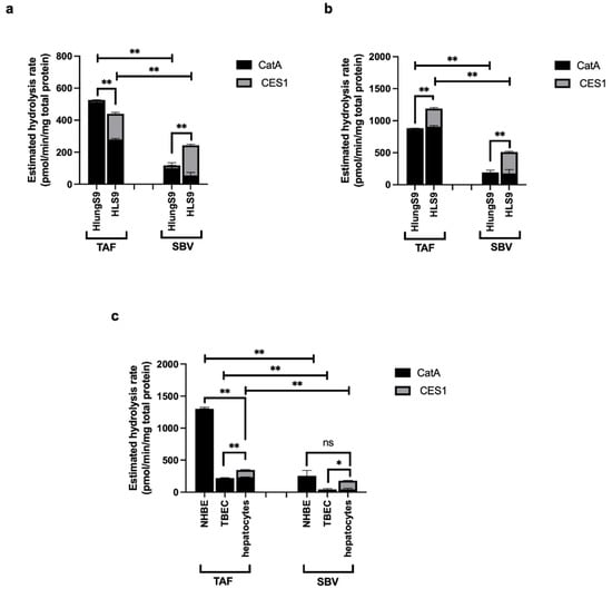 Estimated hydrolysis rates of TAF and SBV in human tissue S9 and primary cells. Estimated hydrolysis rates of TAF and SBV in human tissue S9 based on the enzyme abundance from the study by Li J. et al. [16] (a) and the study by Li R. et al. [13] (b) and in primary human cells (c). The estimated hydrolysis rate of a prodrug in a specific biological system was calculated by summing the CatA and CES1 mediated hydrolysis, which was calculated by timing the enzyme’s activity measured in this study (n = 3) with enzyme’s mean abundance extracted from previous studies (mean ± S.D.). NHBE: normal human bronchial epithelial cells; TBEC: tracheal bronchial epithelial cells. * p < 0.05 and ** p < 0.01 indicate statistically significant difference, “ns” indicates no significant difference. The difference between TAF and SBV hydrolysis rates in each specific biological system was analyzed by Student’s t-test; For each prodrug, the difference between HlungS9 and HLS9 was analyzed by Student’s t-test, and the differences among three primary cells were analyzed by ANOVA test.