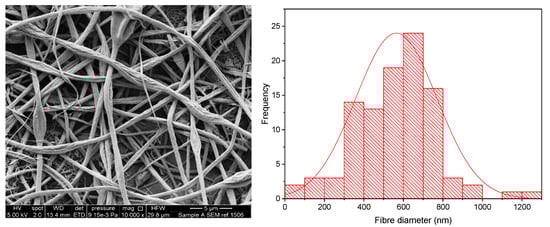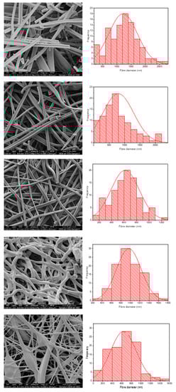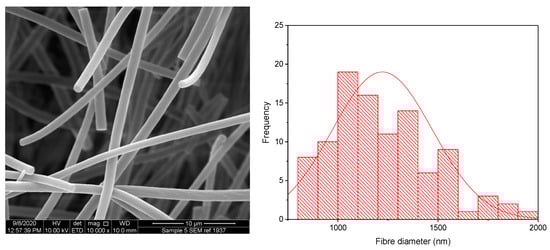 A sample of the fibre collected was adhered onto aluminium scanning electron microscopy (SEM) stubs (TAAB Laboratories, Reading, UK) using a carbon-coated double-sided tape. To render them conductive, a thin coating of gold was applied in a Quorum Q150T sputter coater (Quorum Technologies Ltd., East Sussex, UK) in an argon atmosphere. A scanning electron microscope FEI Quanta 200 FEG (FEI Company, Hillsboro, OR, USA) was used to image the fibre morphology. ImageJ 1.46R software (NIH, Bethesda, MD, USA) was used to measure the diameters of the fibres imaged. OriginPro 9.4 (Origin Lab, Northampton, MA, USA) was used to construct the histograms [25].