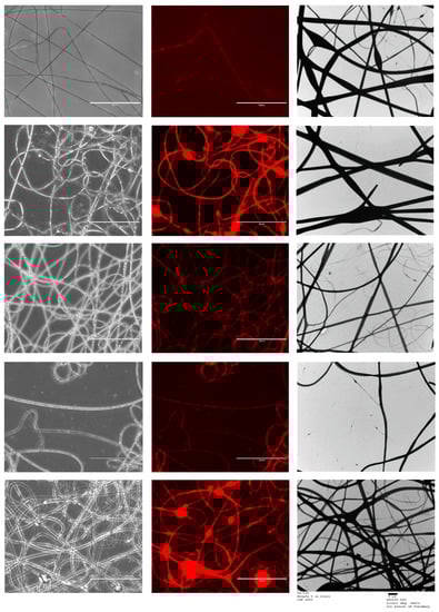 Figure 5 shows the FL microscopy images of the samples in both black and white and with the Texas Red light filter, which illuminates the Rhodamine B that was loaded into the core of all the formulations tested. Both the optical microscopy images and the fluorescent images have an identical appearance, indicating that all the nanofibres represented were successfully loaded with the drug-loaded core solution that contained rhodamine. As the fluorescent image shows homogenous distribution of the dye, it can be assumed that the drug has been loaded homogenously in the nanofibres [40]. TEM images are also shown in Figure 5.