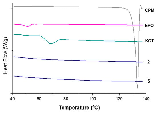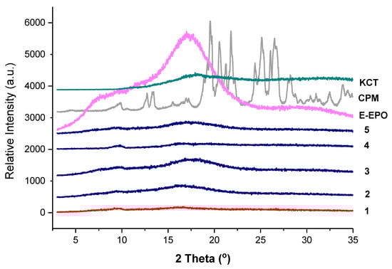 XRD diffraction patterns of pure CPM, E-EPO, KCT and the five co-axial systems electrospun. The formulations labelled 1 to 5 compositions are as detailed in Table 1.