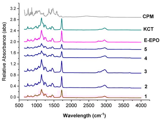 FTIR spectra of pure CPM, raw E-EPO, KCT, and the five co-axial systems electrospun. The formulations labelled 1 to 5 compositions are as detailed in Table 1.