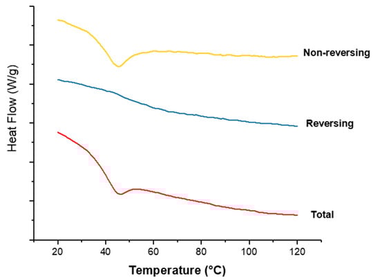 Sample weights ranged from 4 to 8 mg and were sealed in a 40 μL aluminium PerkinElmer standard pan. A pinhole was manually formed in the lids to allow for solvent evaporation. Samples were heated under nitrogen gas (flow rate 50 mL/min) at a heating rate of 2 °C/min ramped up to 150 °C, amplitude ± 0.212 °C, and a period of 40 s. Data analysis were carried out with TA Universal Analysis software, version 4.5A.