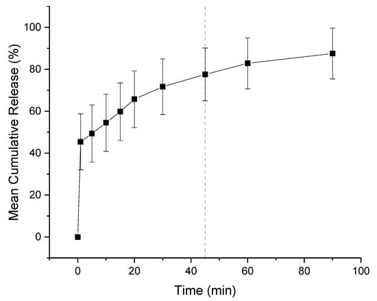 A Sciquip mini shaker (SciQuip, Wem, UK) was used to investigate the release of CPM in a pH 1.2 media to mimic the stomach conditions. 0.1 N HCl was used as the dissolution media. One-millilitre aliquots were removed and replaced with fresh media at the following time intervals: (1, 5, 10, 15, 20, 30, 45, 60, 90, and 120) minutes. Removal and replacement of fluid was taken from the same position on all occasions. A media volume of 15 mL was used. Samples were placed in glass vials and the mesh cover dropped over them at the beginning of the time. Drug amount released was measured using UV spectrophotometry at wavelength of 262 nm. Fibre samples measured 12.30 mg ± 0.7 mg and had a theoretical drug-load of 4.76%, 7.6%, or 18.9% (w/w). Equation of calibration curve in release media: y = 0.0197x + 0.021, R2 = 0.993. A 1 mL quartz cuvette was used, and all experiments were performed in triplicate. Data was collated and analysed using OriginPro 9.4 (Origin Lab, Northampton, MA, USA).