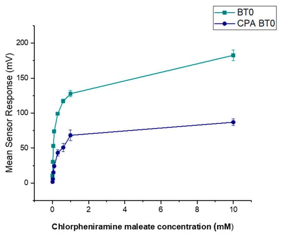 Quinine HCl dihydrate, an anti-malarial drug, is a commonly used bitter drug standard in taste-assessment studies [55]. The dose–response curve using the BT0 sensor is shown in Figure 13. The drug is well detected by the E-tongue for both initial taste and aftertaste measurements, therefore will be used to determine the bitterness threshold for CPM.