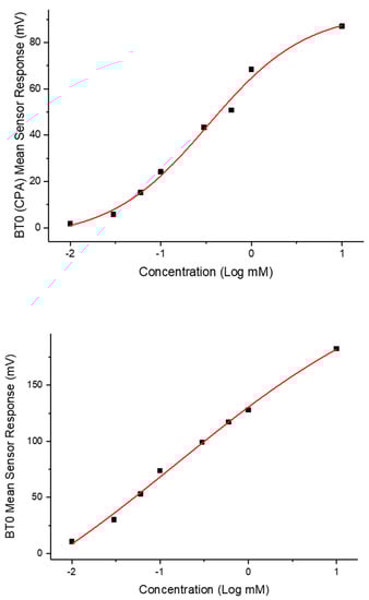 To ensure BT0 was an appropriate sensor for further analysis and comparison with standard bitter drugs, a non-linear Boltzmann fitting was completed on the data-set for both initial taste and aftertaste. A Boltzmann fitting produces a sigmoidal curve which is indicative of an effect plateauing off when reaching a measured maximum [25]. The effect of taste response is not linear but instead logarithmic as explained by the Weber–Fechner law that states that the relationship between a stimulus and the corresponding perceived intensity is logarithmic [26,27]. As shown in Figure 12, the initial taste represents a sigmoidal curve and thus successful Boltzmann fitting, indicating the use of BT0′s initial taste curve for further analysis is appropriate. The fitting produced an R2 = 0.99 for initial taste and R2 = 0.98 for aftertaste.
