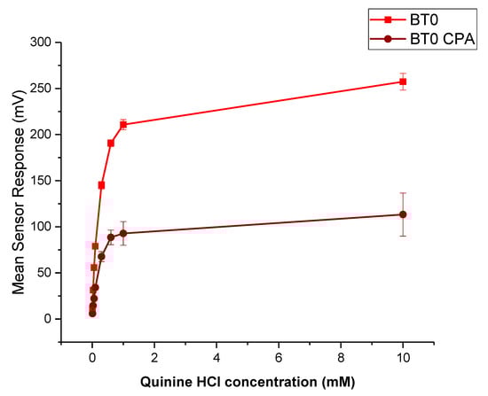 Dose–response curve representing initial taste and aftertaste (CPA) for quinine HCl dihydrate as detected by BT0 sensor.