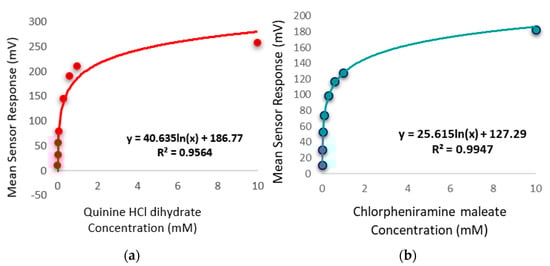 The bitterness threshold for quinine HCl dihydrate from a human sensory test was determined to be 0.26 mM [56] which equates to an E-tongue BT0 sensor output of 132 mV when fitted on a logarithmic trend-line using the equation in Figure 14a.