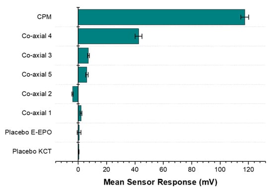 Any mean sensor response between −5 mV and 5 mV is deemed undetectable by the E-tongue’s sensors. Co-axial system 2 was deemed undetectable by the E-tongue, as the sensor was stabilising in the negative range and the measurement was within –5 mV to 5 mV, showing effective taste-masking. This is likely due to the fact that E-EPO was in the shell, and because it was used at a higher concentration than KCT, it is hypothesised that a thicker more protective shell was formed, causing the superior taste-masking. The placebo fibres were undetectable, as expected.