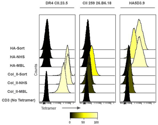 Impact of biotinylation strategy on pMHC tetramer binding. Cells were stained with tetramerized pMHCs at 187.5 nM monomer concentration and analyzed by flow cytometry. Shown are the apparent high affinity collagen II hybridoma line CII.DR4.23.5; the apparent lower affinity CII.26B6.18 hybridoma line; and the HA peptide specific line HA5D3.9. Site-specific conjugates (HA-Sort and Col_II-sort) are compared to random conjugates (HA-NHS and Col_II-NHS); commercial pMHC tetramers (MBL) were included as a positive control, and cells treated with CD3 only and no tetramer as a negative control.