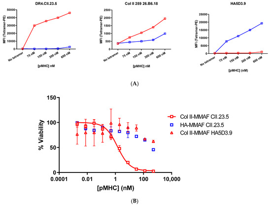 The biotinylated and drug conjugated pMHCs were then tetramerized by the addition of streptavidin-PE and tetramer binding to cognate cell lines was assessed by FACS. The HA pMHC bound to the HA cell line at all concentrations tested and showed weak non-specific binding to the Col_II cell lines at the highest concentrations. The Col_II pMHC showed a strong binding signal with the DR4.CII.23.5 cell line, and a weaker signal on the CII.26B6.18 line (Figure 3a). The tetramers were then evaluated for specific killing of Col_II positive cell lines.