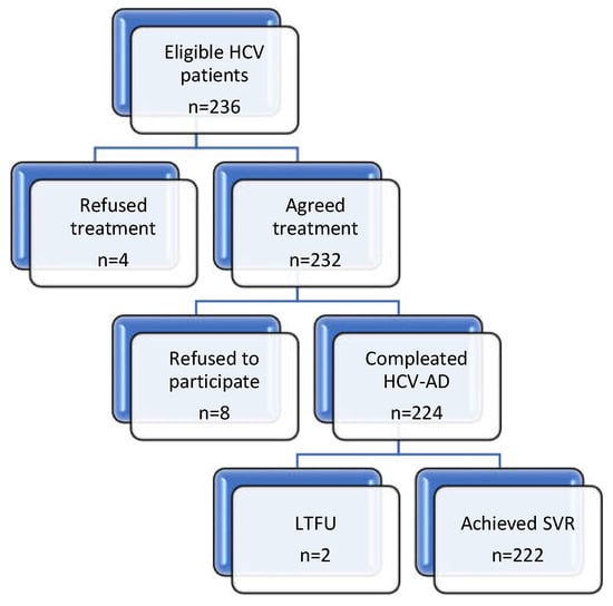A total of 236 were enrolled across the University County Hospital of Craiova, Romania, from March 2020 to April 2021, as in Figure 1. Of the eligible HCV patients, 4 refused DAA treatment, 8 refused to participate, and 2 patients were lost to follow-up.