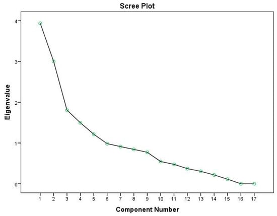 Next, the items included in the extracted five factors were reviewed. Factors with less than three items were removed to ensure that each factor was well measured. Reliability was assessed for every factor: if Cronbach’s α was greater than 0.7, all the items remained into that factor. Factor 1 (Q1, Q3, Q4, Q9) had α = 0.888 and we included them in the final questionnaire. Factor 2 (Q5, Q16, Q17, Q18) had α = 0.681 and after Q16 and Q18 were deleted, α = 0.732. Factor 3 (Q6, Q12, Q14) had α = 0.720 and after Q12 was deleted, α = 0.864. Factor 4 (Q8, Q11, Q13) had α = 0.786 and after Q11 was deleted, α = 0.831. Factor 5 contained only two items (Q10, Q15). The other items were not included in factors.
