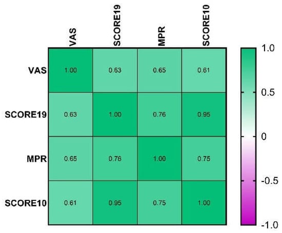 Spearman’s correlation analysis demonstrated significant positive correlations between adherence scores calculated with HCV-AD10 (SCORE10) and VAS (ρ = 0.61, p < 0.001) or with HCV-AD10 and MPR (ρ = 0.75, p < 0.001), as shown in Figure 3.