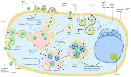 Charged biomolecules are mainly transported across the cell membrane through an active endocytosis transport mechanism [49]. Chitosan is known to be transported mainly via this mechanism and specifically, the endocytosis of chitosan NPs involves the two major pathways of phagocytosis and pinocytosis. Furthermore, chitosan uptake by pinocytosis can be divided into caveolin-mediated, cadherin-mediated, and clathrin-mediated uptake. Phagocytosis is the uptake of particles larger than 250 nm, whereas pinocytosis involves the pathways of cellular uptake of chitosan and is dependent on its size, charge, and surface modification. Clathrin-mediated cellular uptake involves transport via clathrin-coated pits, leading to internalization followed by integration into late endosomes delivering their cargo to lysosomes [50]. Caveolae-mediated endocytosis utilizes cholesterol-rich, flask-shaped invaginations in the plasma membrane, which internalize from the plasma membrane with the help of GTPase dynamin, delivering cargo to lysosomes [50,51]. The different interactions of chitosan with cells are depicted in Figure 1, and further visual representation of chitosan NPs with cells using confocal microscopy can be found in the following references [9,52,53,54].