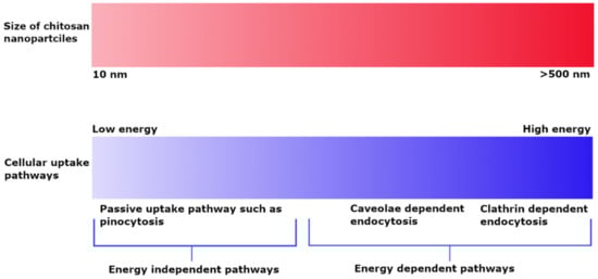 The cellular uptake of chitosan NPs is based on their size and is dependent on the type of cell line and experimental conditions. PLGA NPs coated with chitosan having a particle size of up to 200 nm demonstrated more extensive cellular uptake into A549 cells as compared to 1000 nm particles and suggested an energy-dependent clathrin-mediated endocytic process [55]. The cellular uptake of chitosan particles loaded with ovalbumin and FITC–bovine serum albumin on bone marrow-derived dendritic cells and the RAW 264.7 mouse macrophage cell line indicated that uptake was dependent on size rather than incubation time and concentration. Particles in the 1 µm range were taken up to a greater extent by both macrophage and dendritic cells as compared to smaller (300 nm) and bigger (3 µm) particles [56]. In contrast, FITC-labeled chitosan NPs having a particle size of about 250 nm exhibited clathrin-mediated endocytosis; phagocytosis occurred to a smaller extent in macrophages [9]. The uptake of smaller chitosan NPs in the 25 nm range in L929 fibroblast cells indicated a passive uptake, whereas the uptake of larger NPs of up to 150 nm was more energy-dependent in the presence of sodium azide. Both NP sizes showed caveoli- and lipid raft-dependent endocytic processes [57]. Observation of the dependence of the uptake pathway on charge indicates that non-phagocytic cells preferentially uptake cationic NPs, although charge density and hydrophobicity also have a role. Both anionic and cationic charged chitosan NPs prefer clathrin-mediated endocytosis, although no general rule applies [58]. He et al. investigated the phagocytic and non-phagocytic uptake of rhodamine-labeled negatively charged carboxymethyl chitosan NPs and positively charged chitosan hydrochloride-grafted NPs with particle sizes of 300 nm and 500 nm in murine peritoneal macrophage cell lines. Positively charged particles displayed greater phagocytic uptake as compared to negatively charged particles. Similarly, the non-phagocytic uptake of these particles favored positively charged NPs as compared to negatively charged ones, although the extent of uptake was highly dependent on the type of cell line. Furthermore, the uptake process was highly energy dependent, as demonstrated by the observation of significant inhibition of uptake at 4 °C. Clathrin and caveolae-mediated cell uptake processes were also common [59]. The effect of particle size on uptake pathways is summarized in Figure 2.